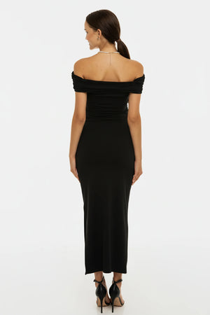 Дълга елегантна рокля с паднали рамене - черна