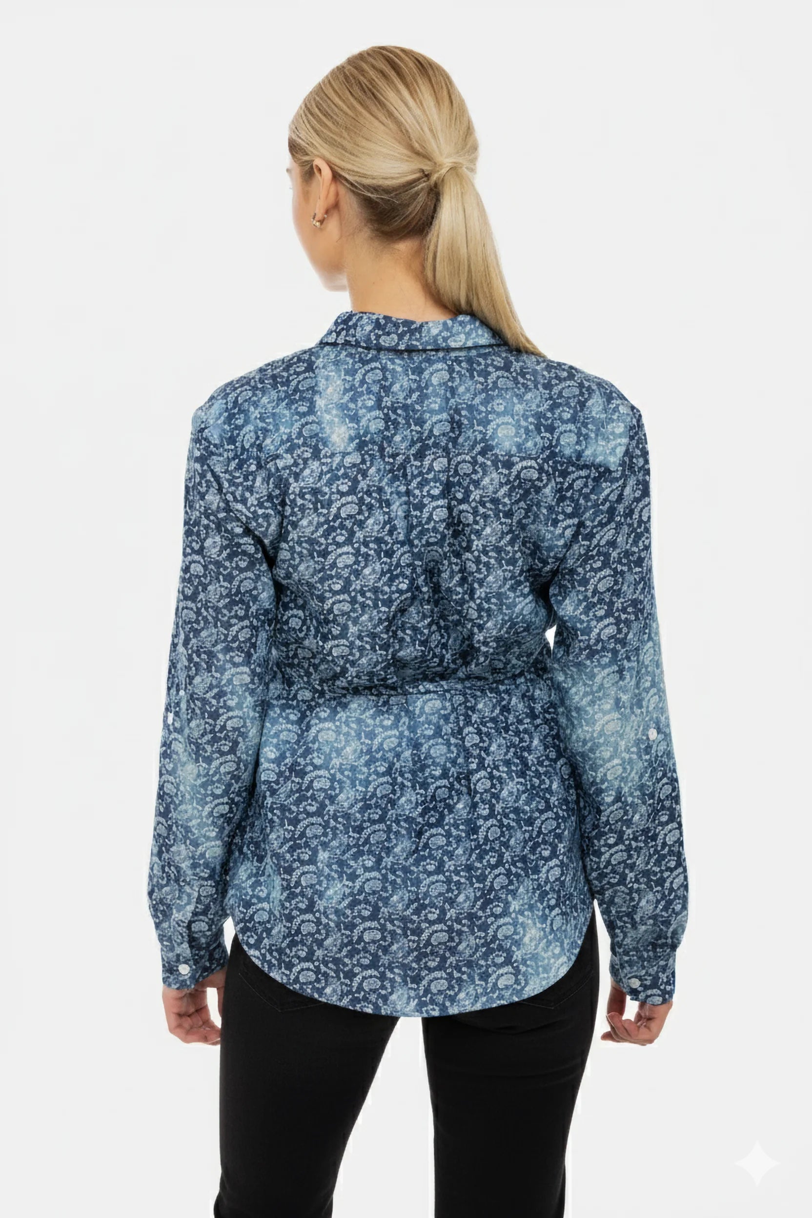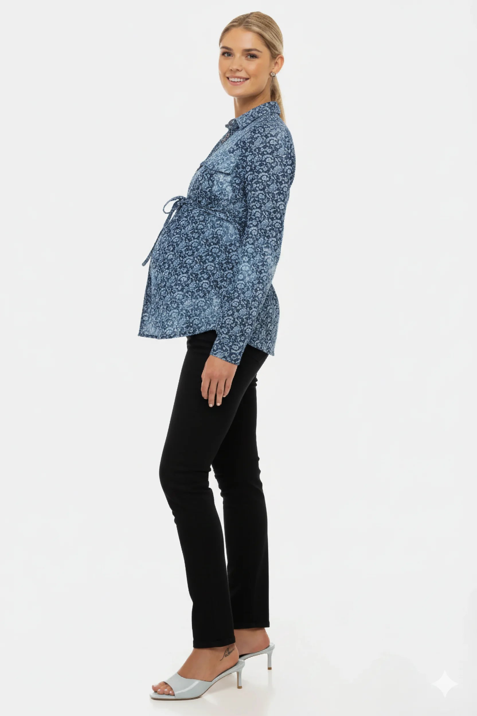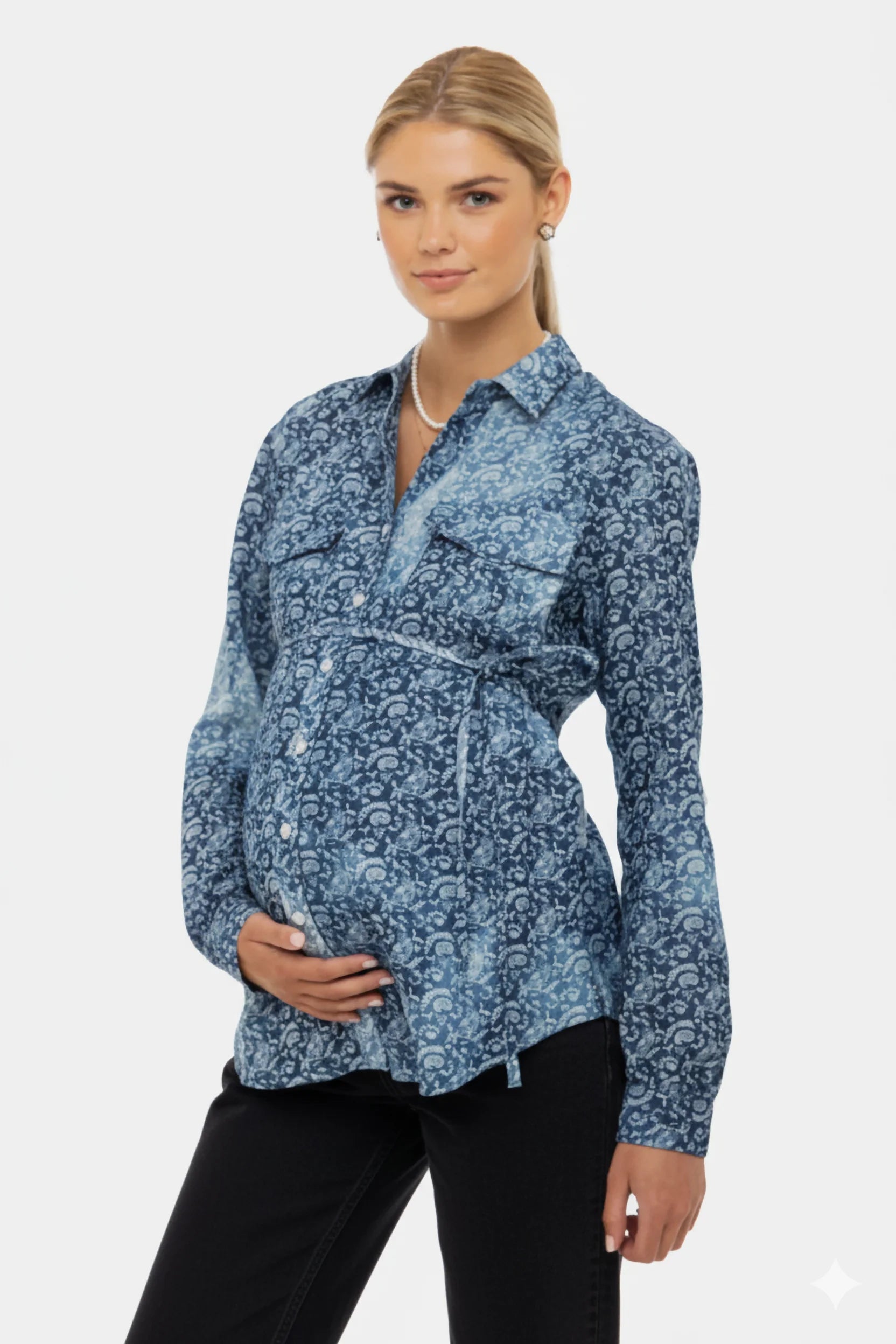 Риза за бременни от лек памучен деним с флорален принт – комфортна, дишаща и лесна за съчетаване с дънки или клин.