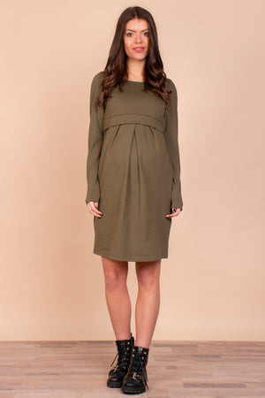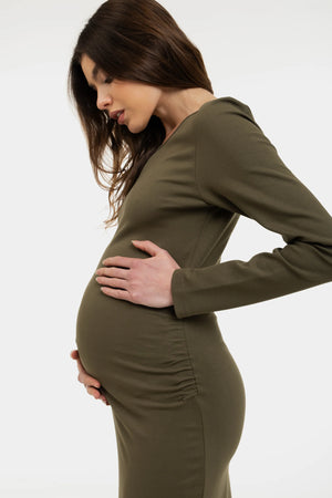 Рипсена памучна рокля за бременни и кърмещи - маслиненозелена