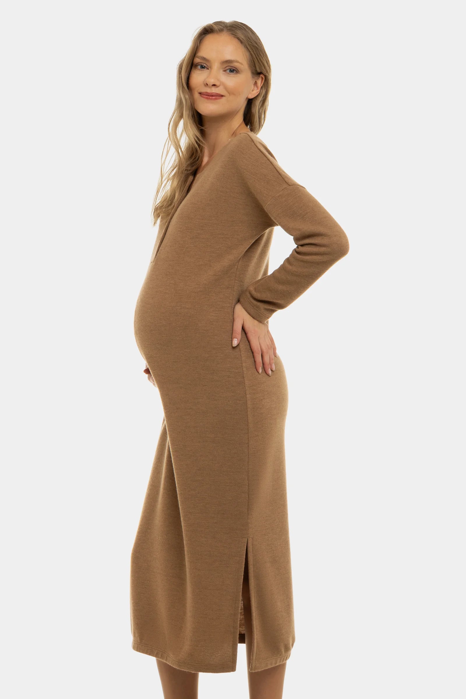 Дълга плетена рокля за бременни и кърмещи - карамел