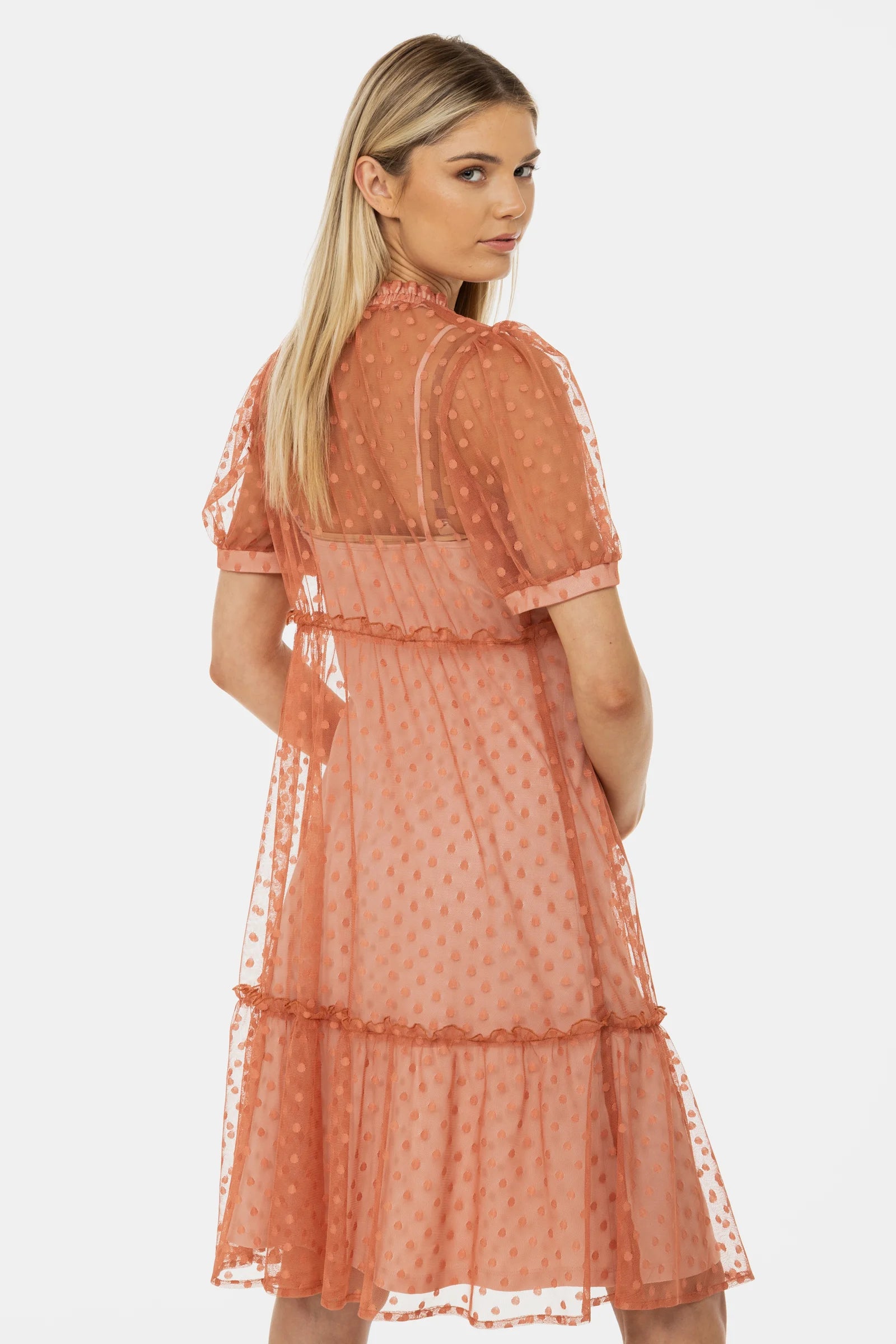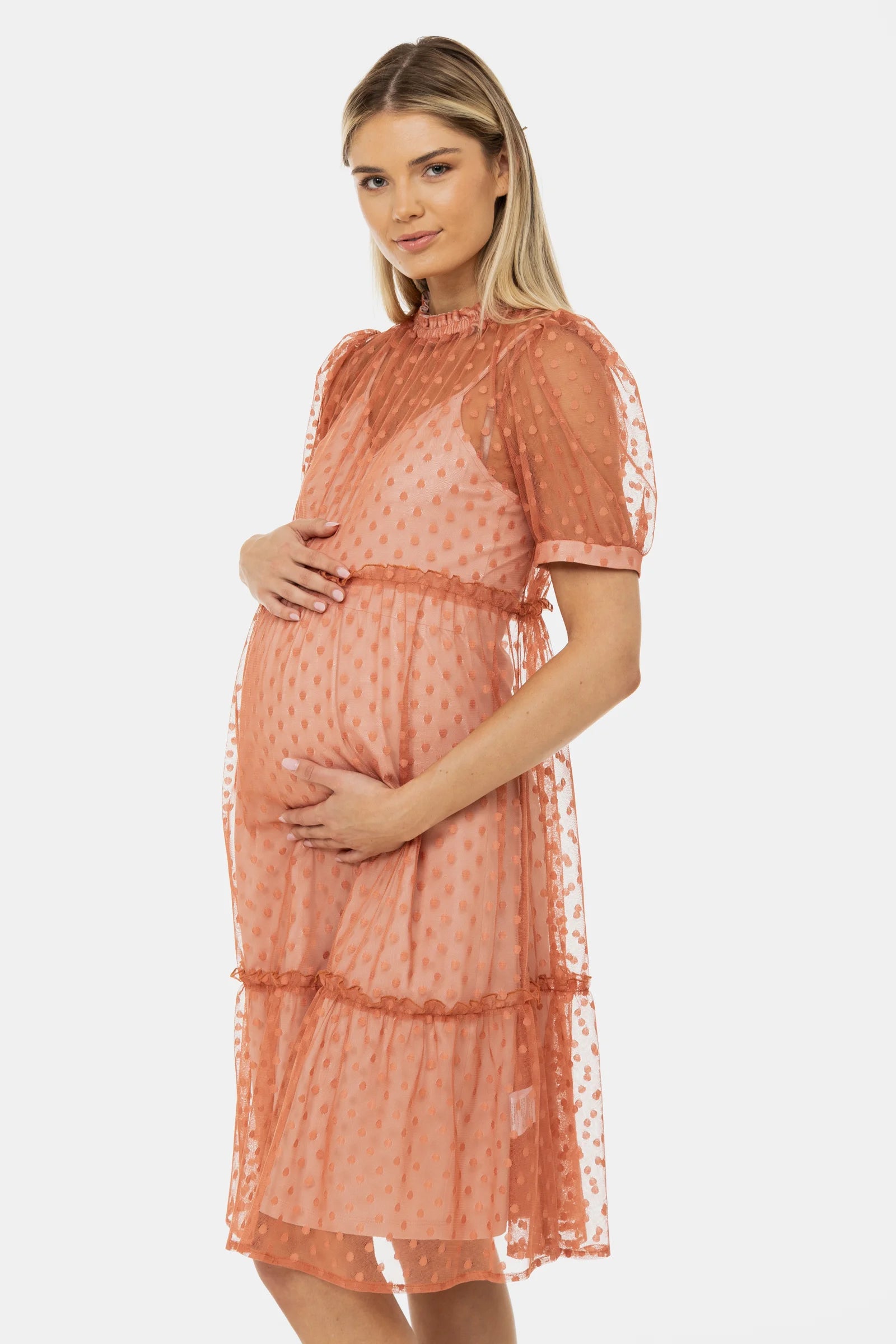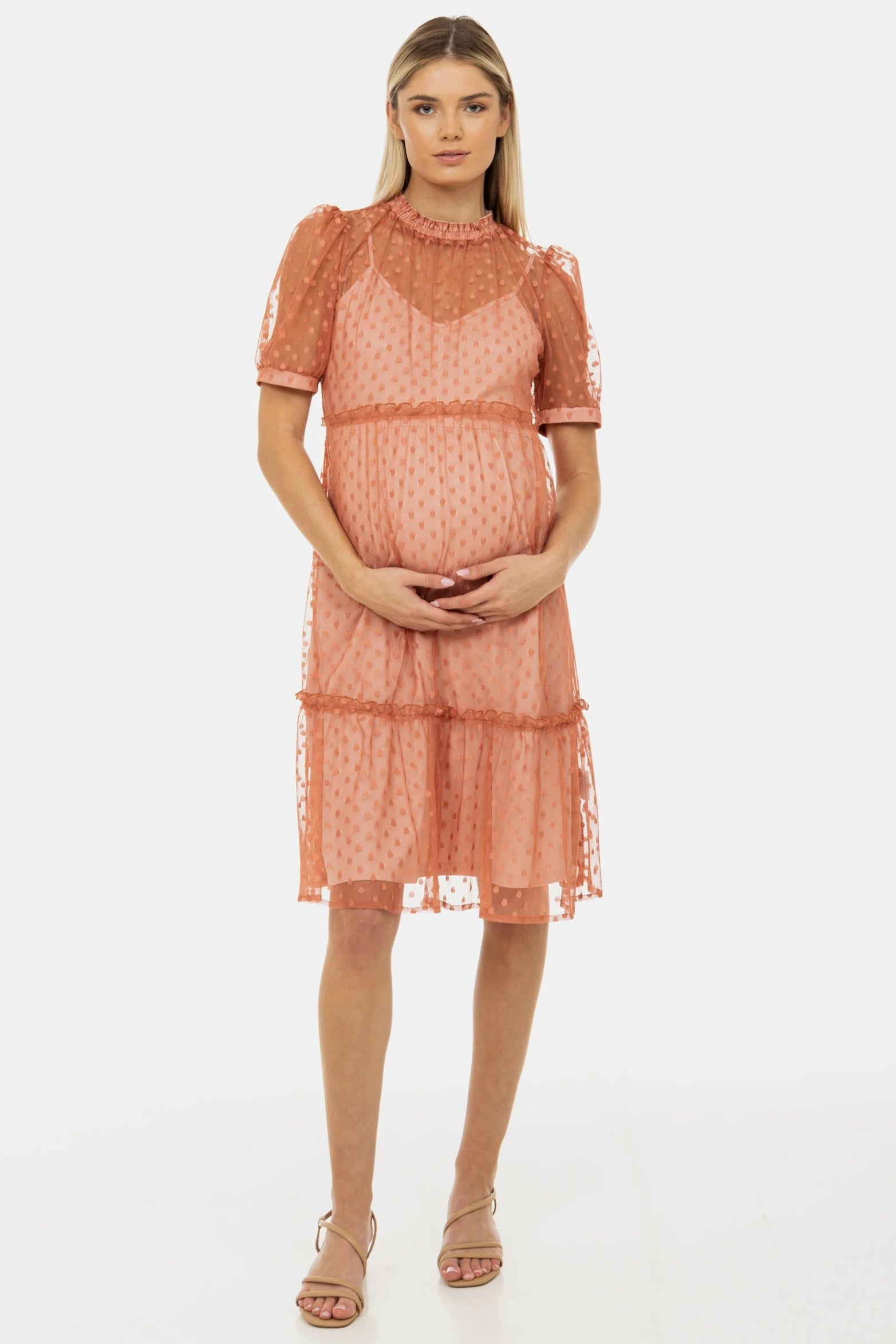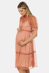 Ефирна рокля за бременни от тюл на точки - прасковена