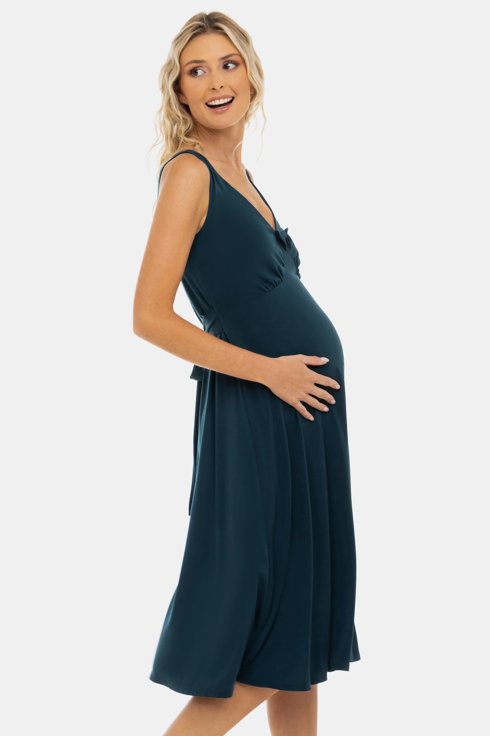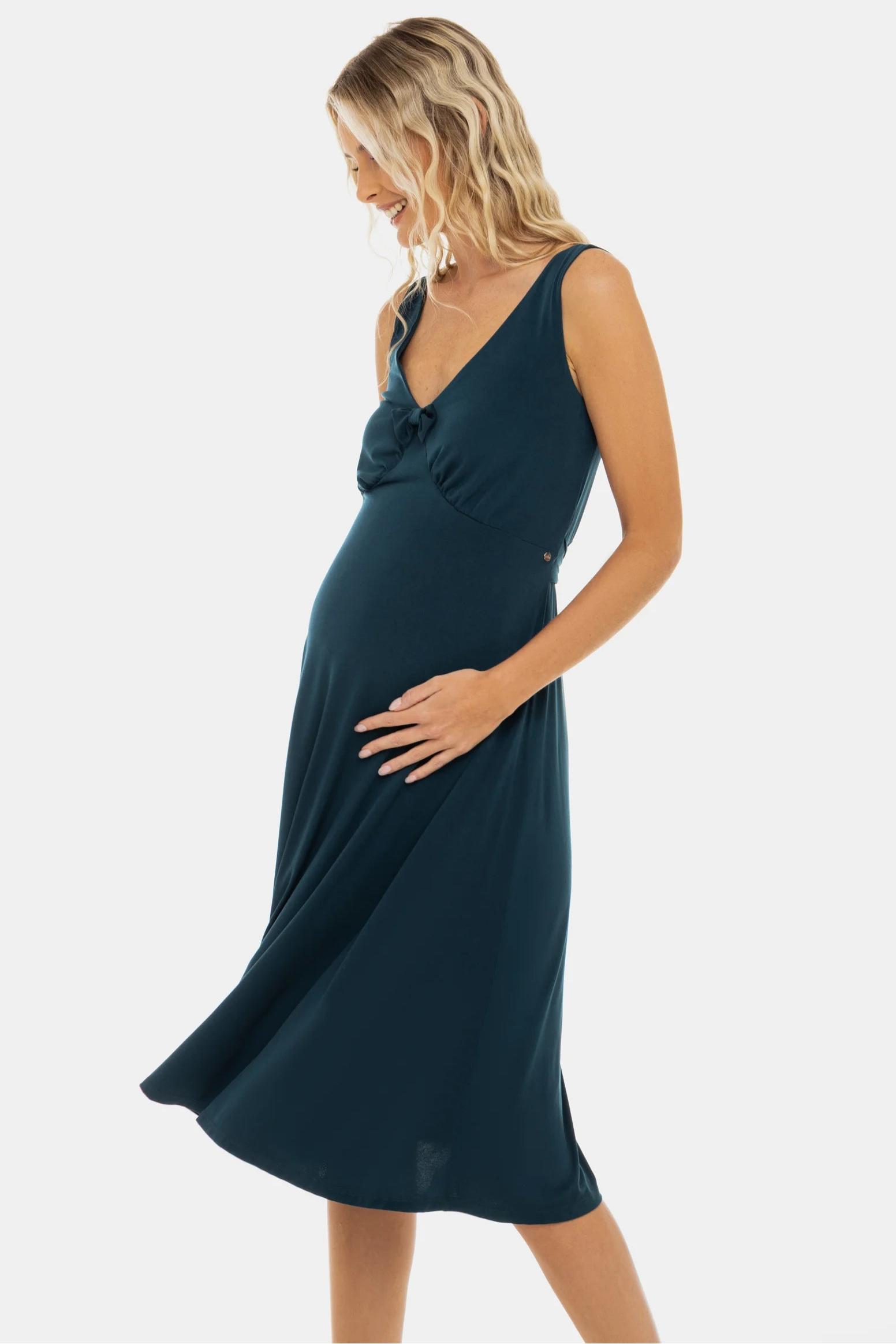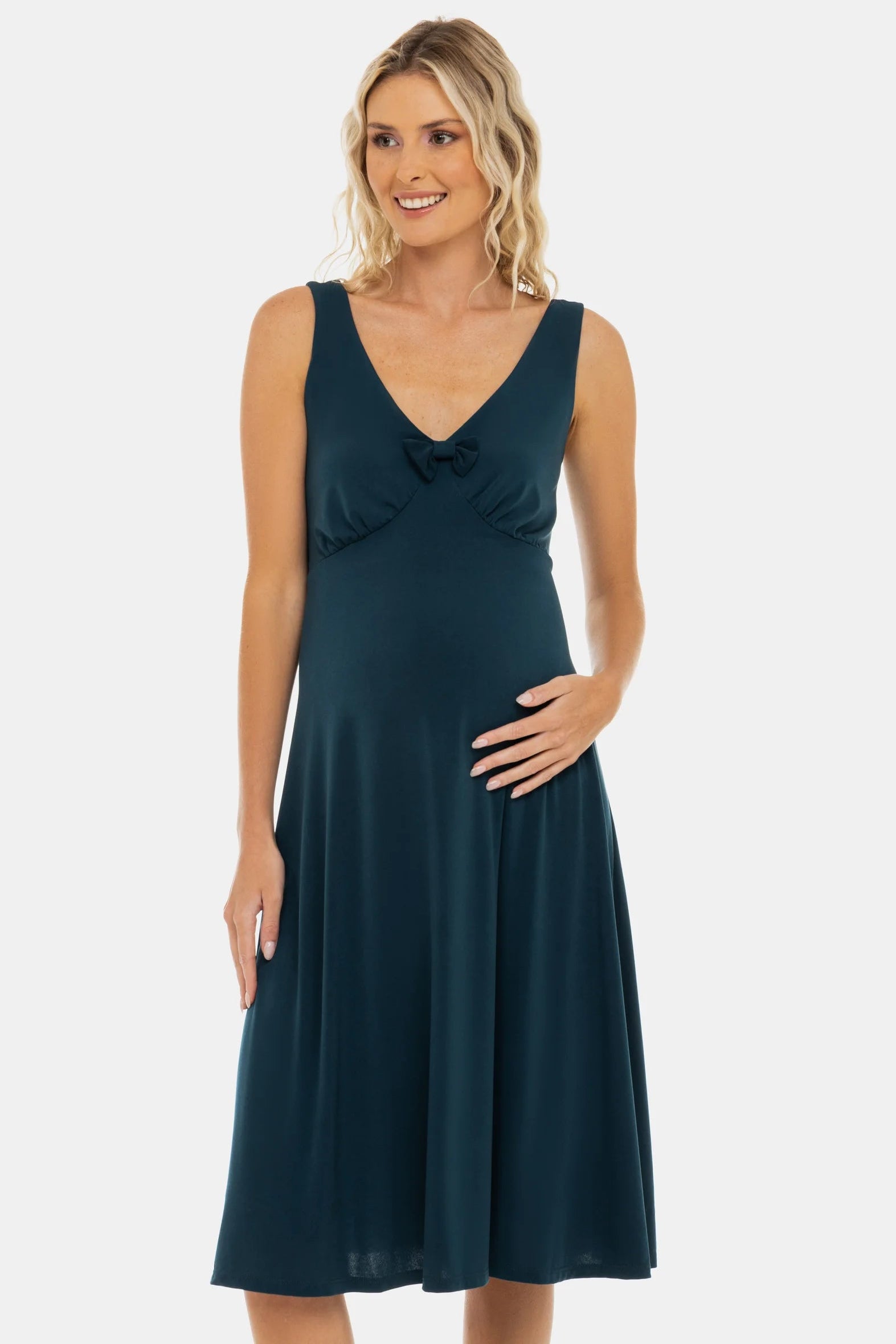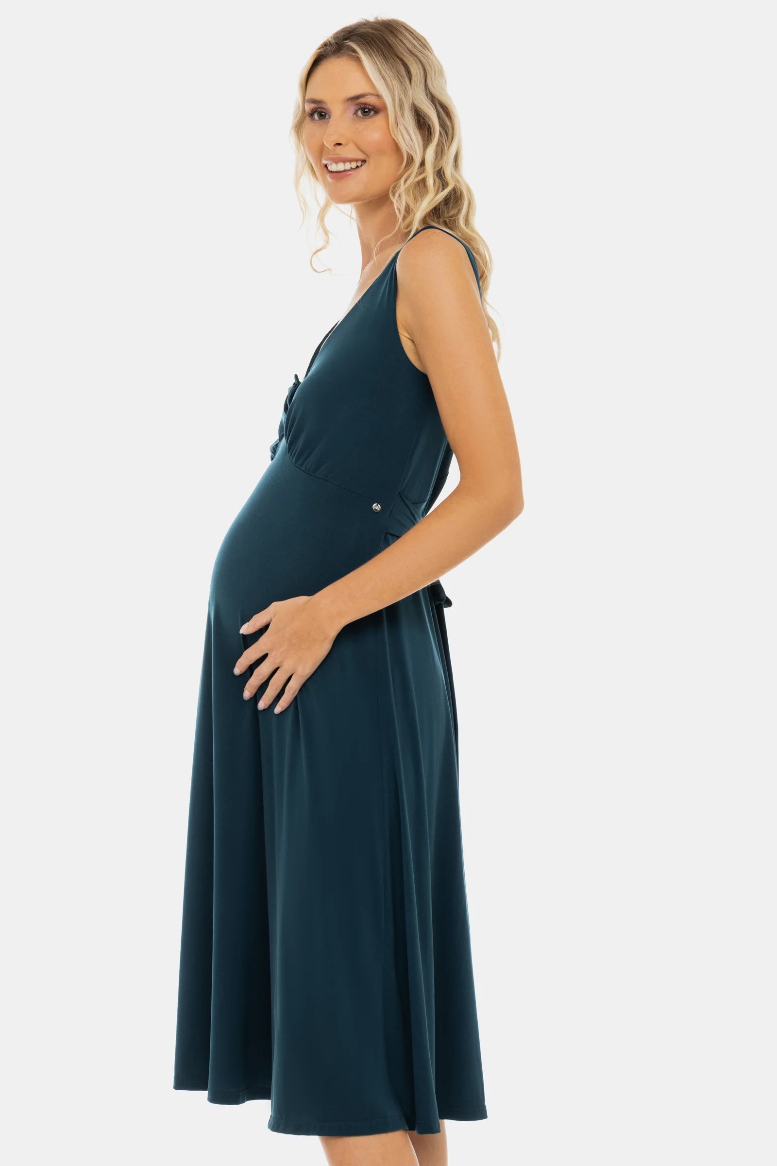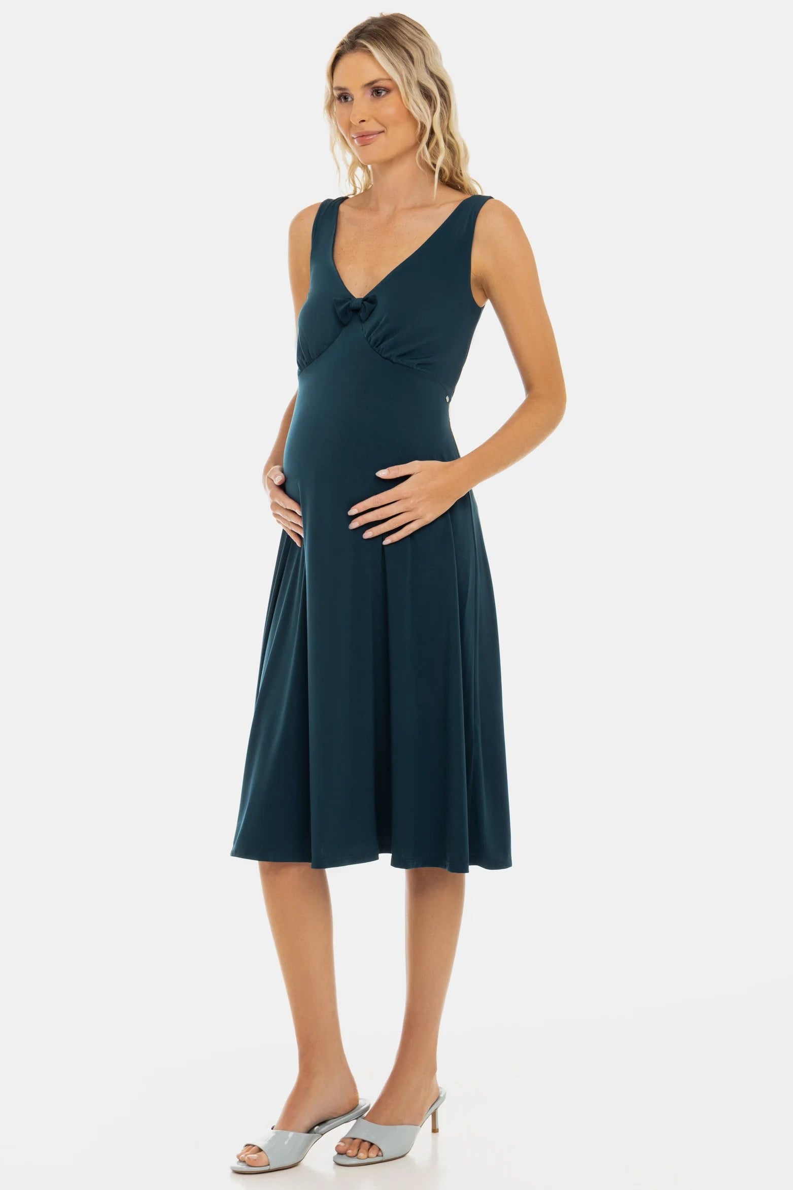 Ефирна рокля за бременни с набори и панделка - тюркоаз