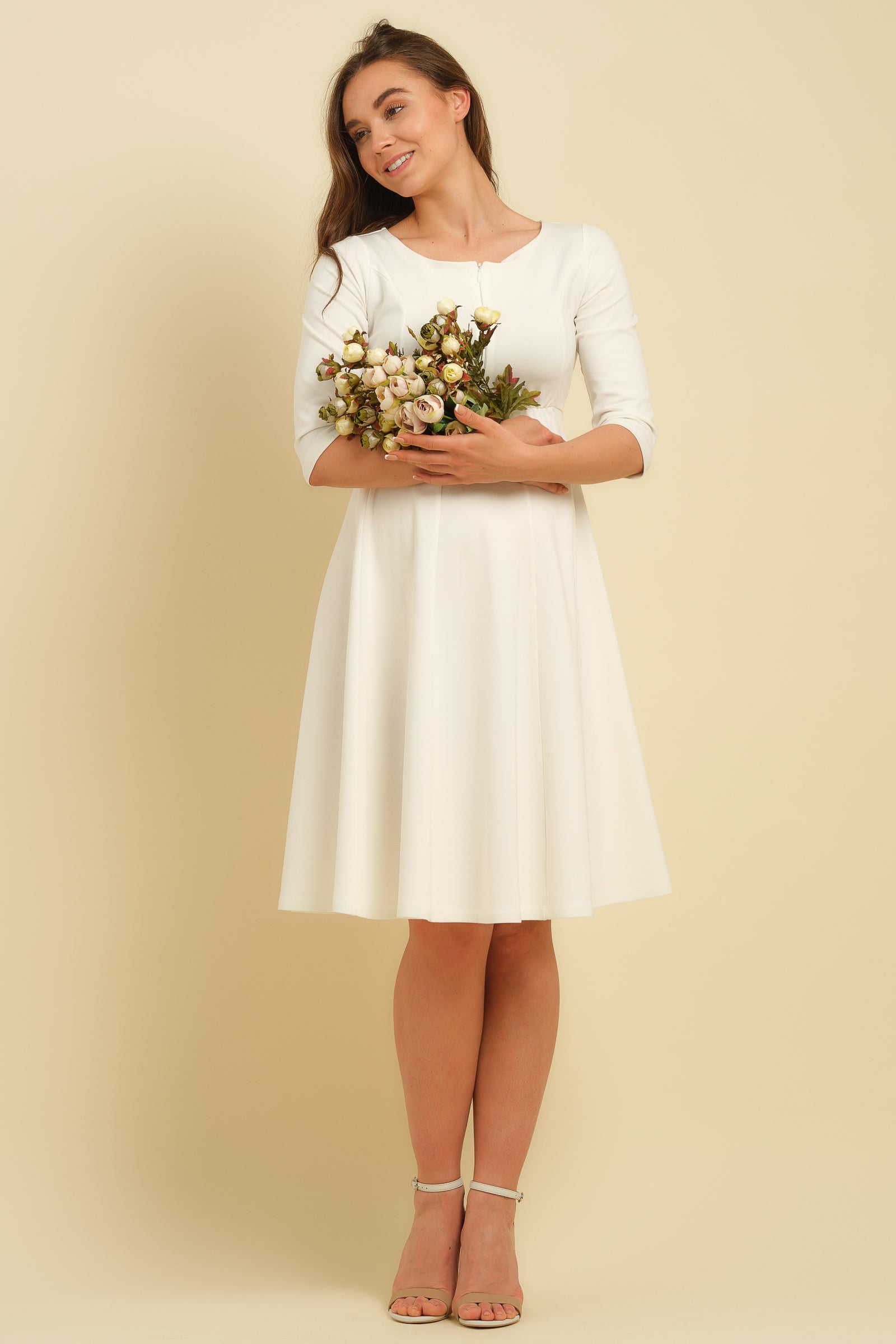 - Роклята е изработена от елегантно падащо трико в екрю