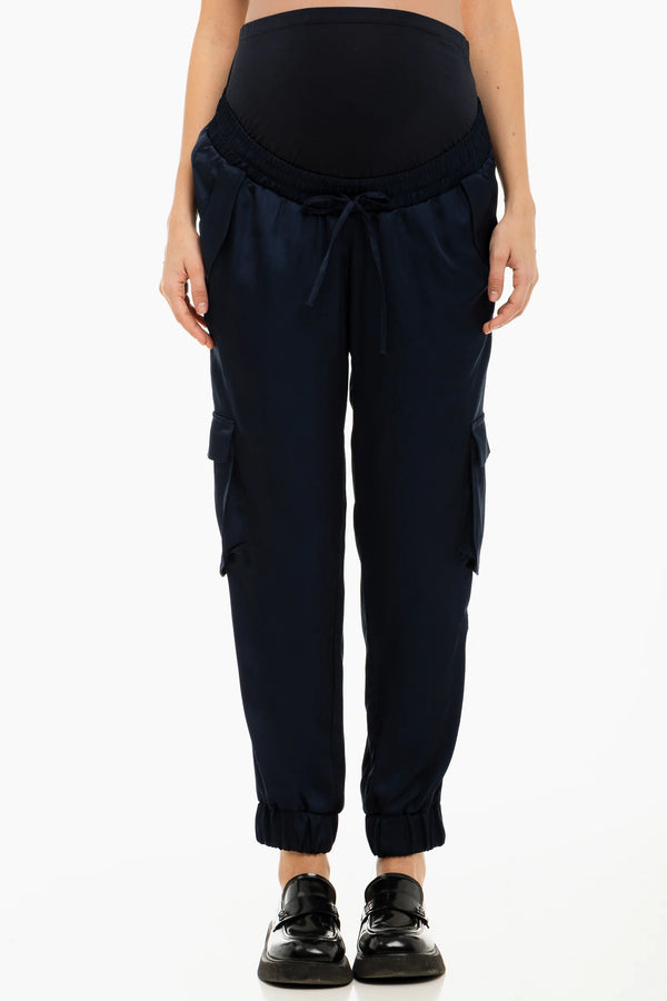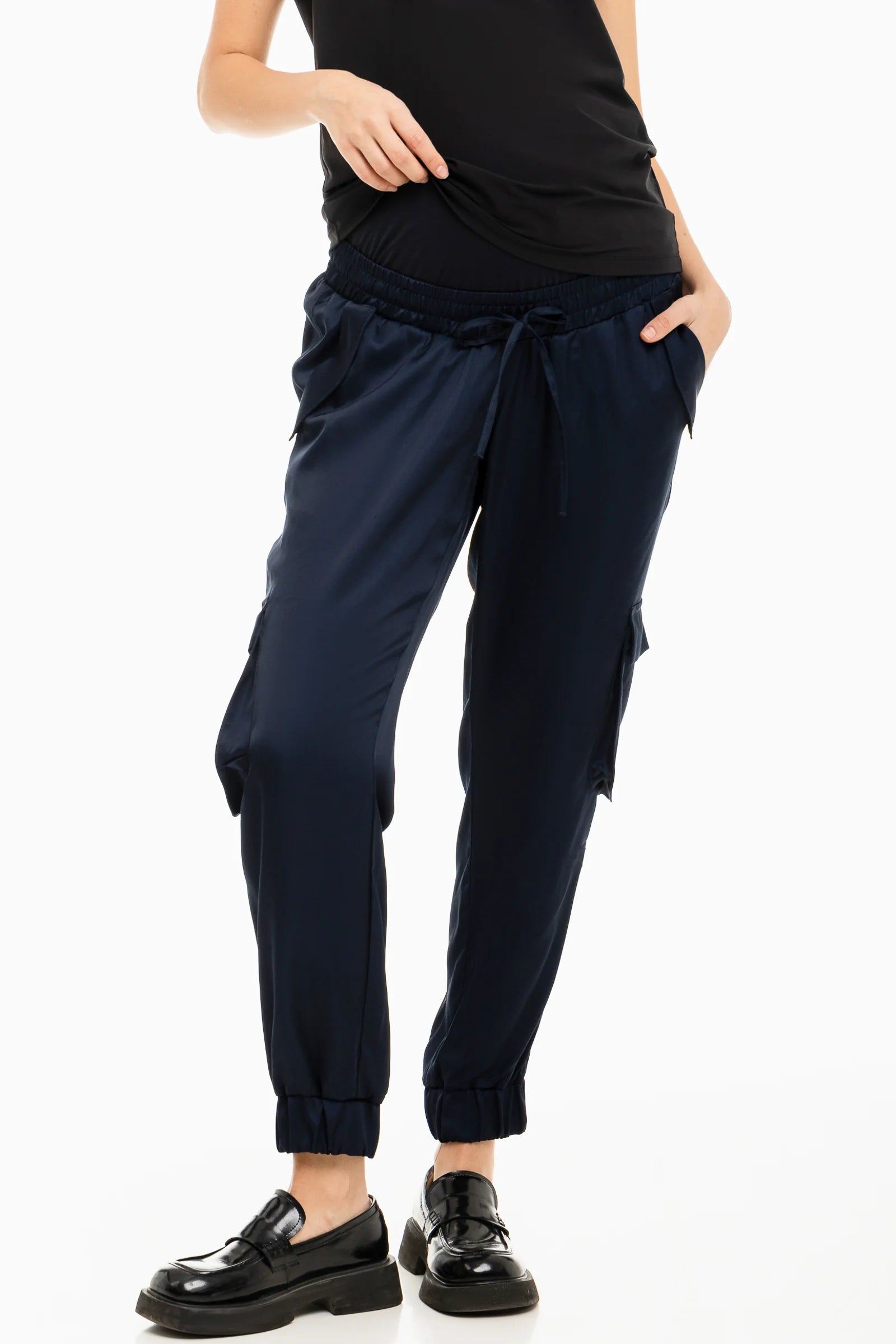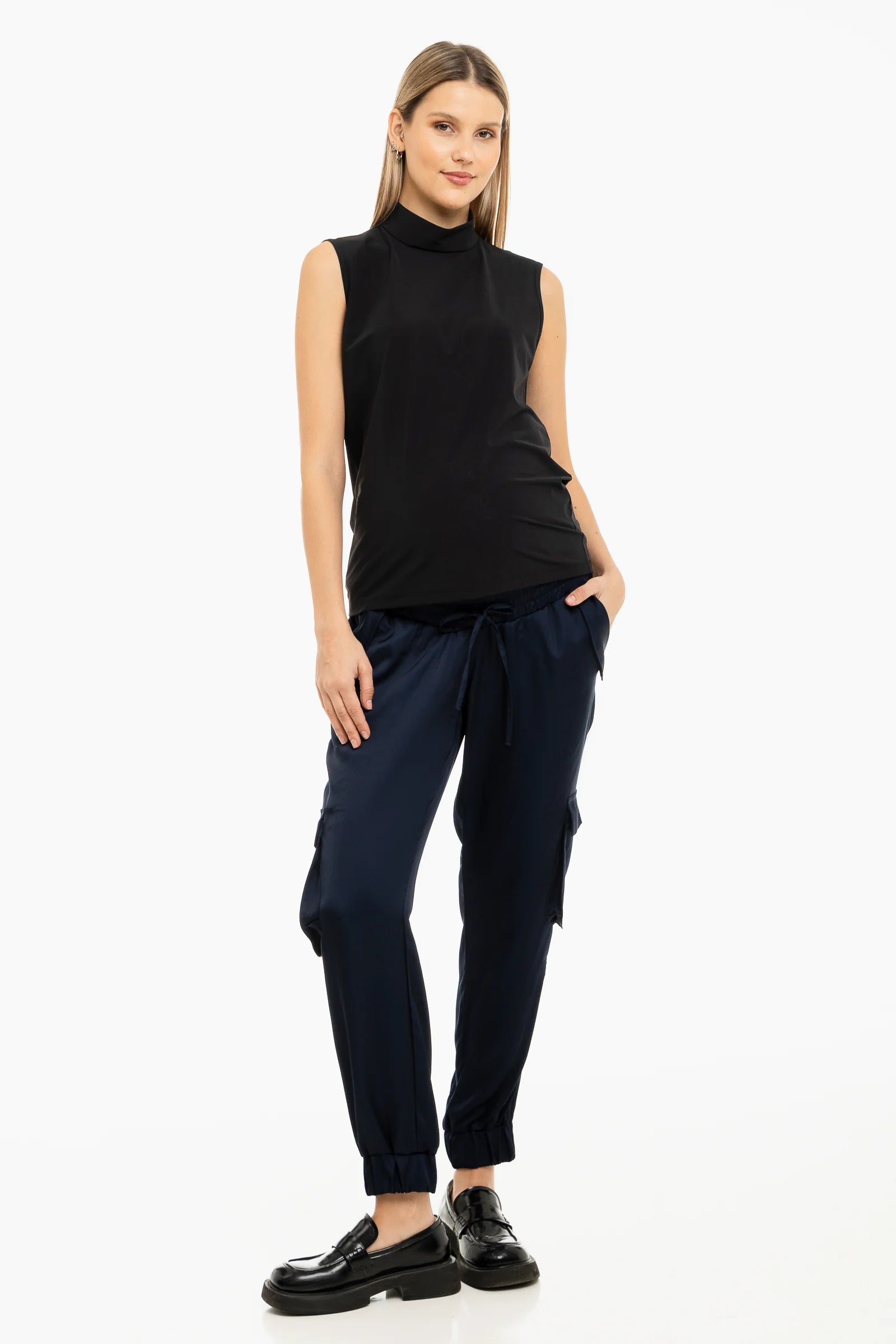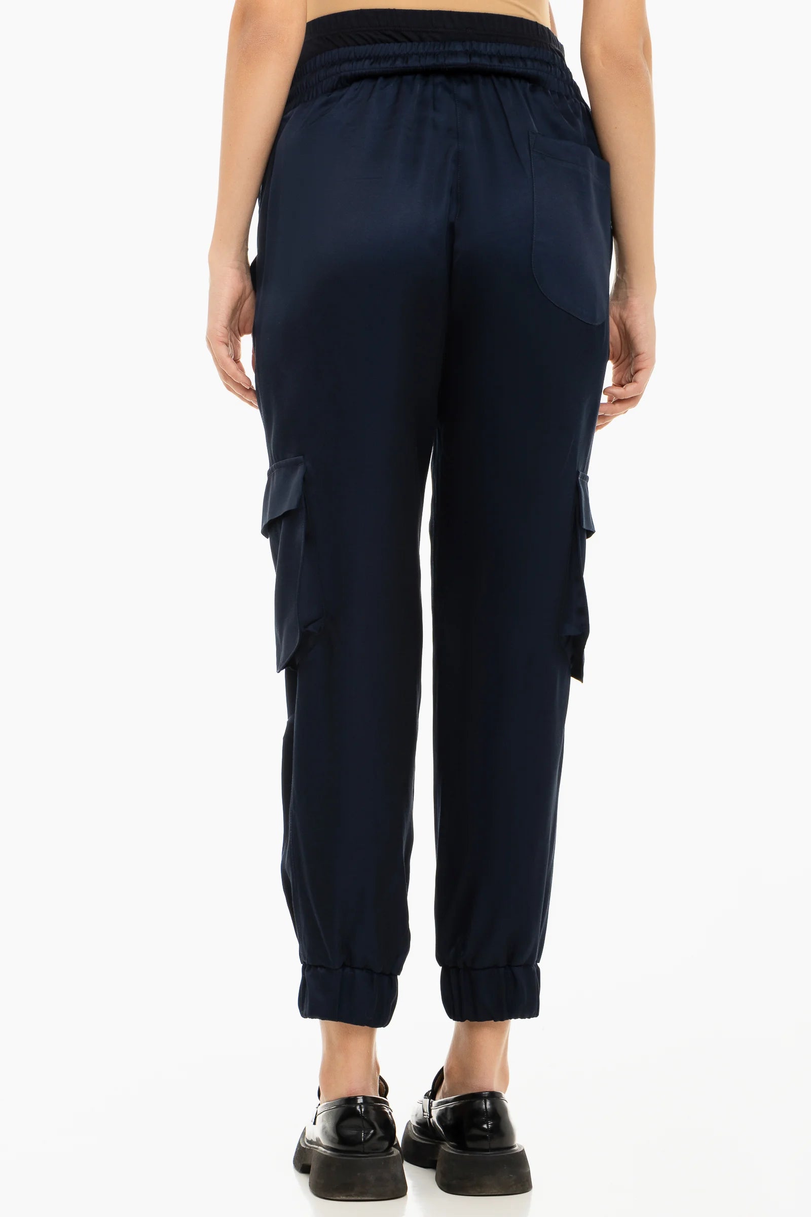 - Елегантен карго панталон от сатенирана материя в тъмносиньо